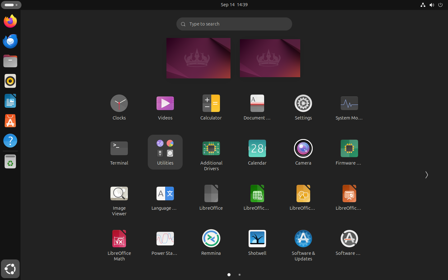 סגרו את Firefox לבינתיים. את היישומונים ברציף אפשר לשנות להעדפותיכם (נתנסה בזה מאוחר יותר). לאובונטו הרבה יותר יישומונים ממה שגלוי ברציף, וכדי לראות את כולן נלחץ על הכפתור בפינה השמאלית התחתונה ששמו “Show Apps”, ונראה את המסך להלן: