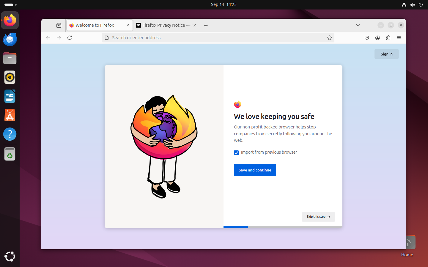 יישומונים ניתן לפתוח באופן מהיר בעזרת הפס השמאלי של שולחן העבודה, שנקרא “רציף ”. נסו לפתות הדפדפן Firefox (הסמל הראשון מלמעלה):