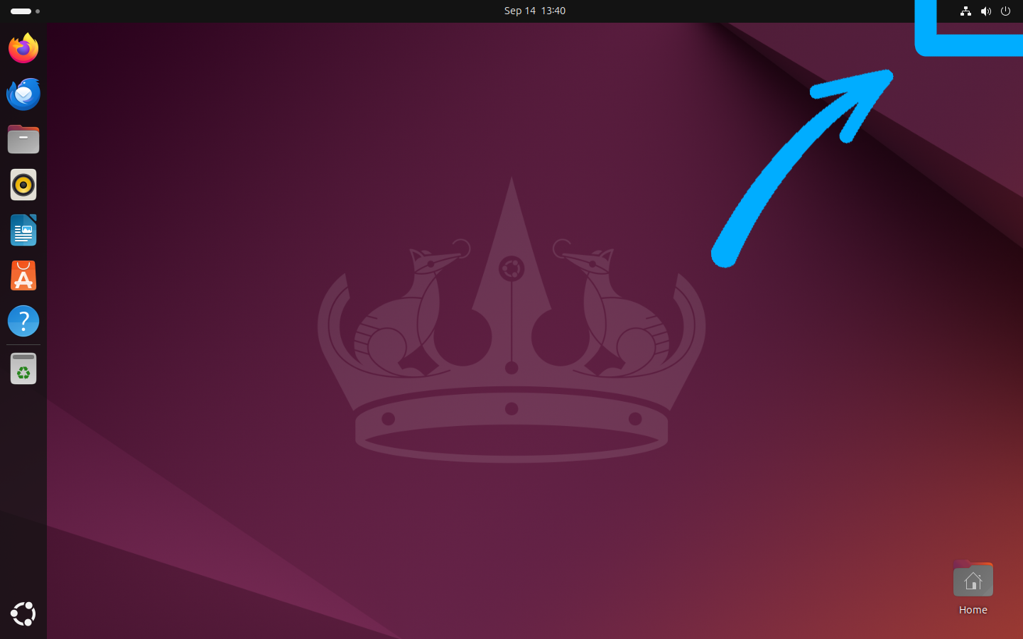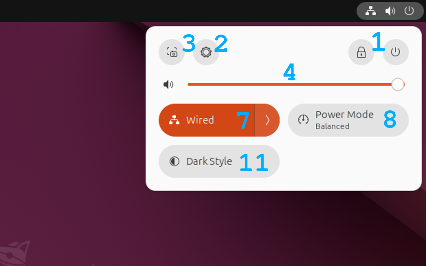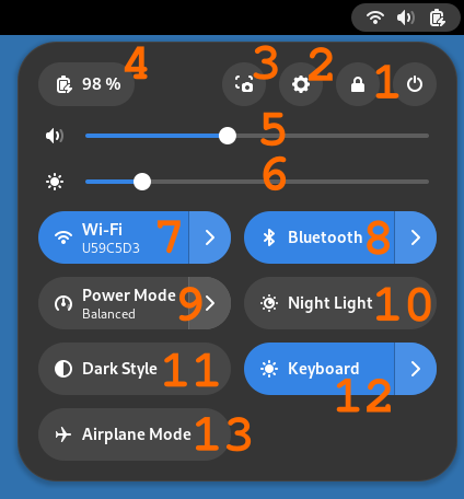נתחיל בפס העליון, בו תמצאו כל מני הגדרות מערכת, את השעה, לוח שנה ועוד כמה דברים. בצד הימני של הפס העליון (כלומר, בפינה הימנית העליונה של המסך) נמצא כפתור המורכב משלושה סמלים: